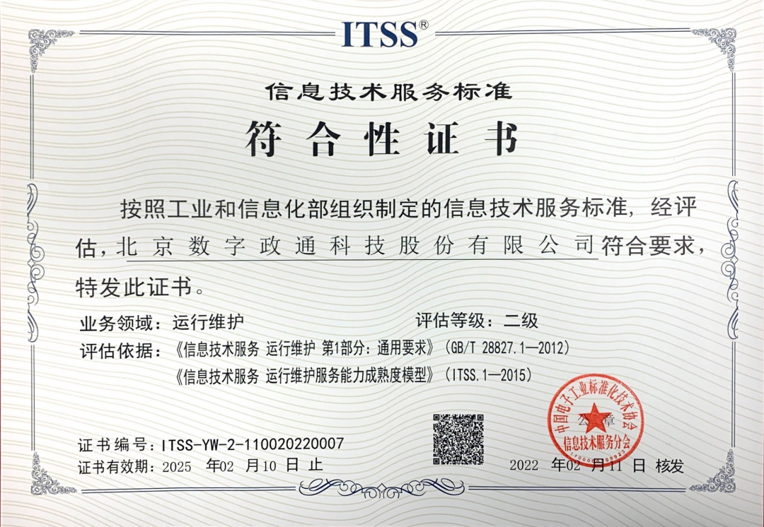 近日,数字政通取得《(ITSS)信息技术服务运行维护标准符合性二级》证书。ITSS(信息技术服务标准库)是工业和信息化部、国家标准化委牵头制定的一套成体系和综合配套的信息技术服务标准库,全面规范了IT服务产品及其组成要素,用于指导企业实施标准化和可信赖的IT服务。