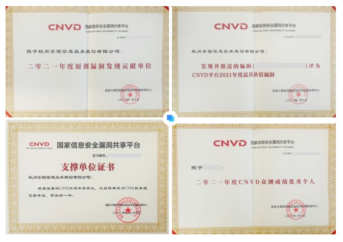 CNVD为最具社会影响力的国家级漏洞库,建立了安全漏洞的统一收集验证、信息发布和应急处置体系,在党政机关和重要行业单位威胁预警、安全保障以及应对大规模漏洞攻击威胁、维护良好漏洞生态秩序方面发挥了重要作用。安恒信息早在CNVD成立之初,就是其最早的技术合作单位之一。此次CNVD授予4项荣誉,是对安恒信息在发现、收集、分析、报送、应急处置安全漏洞这项专业实力的权威认可,同时也激励着我们不断开拓创新,提升网络安全技术能力。