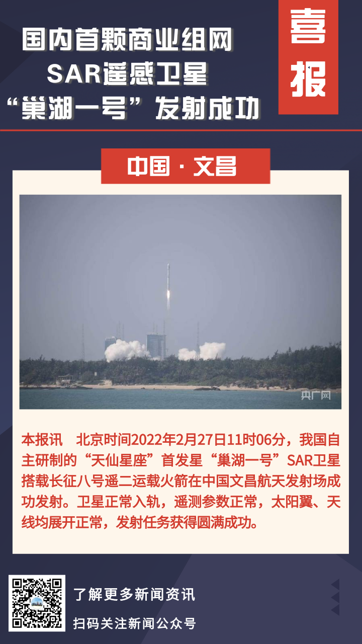 2月27日11时06分,我国自主研制的“天仙星座”首发星“巢湖一号”SAR卫星搭载长征八号遥二运载火箭在中国文昌航天发射场成功发射。卫星正常入轨,遥测参数正常,太阳翼、天线均展开正常,发射任务获得圆满成功。