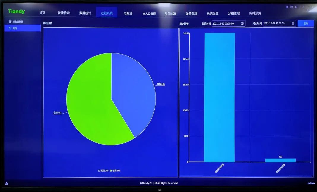 在后端管理中,无需额外搭配PC即可实现平台管理。K200解存管一体机自带管理平台,不仅能组合视频、解码上墙,还能实现平台运维,实时显示摄像机在线数量、报警发生数量等。