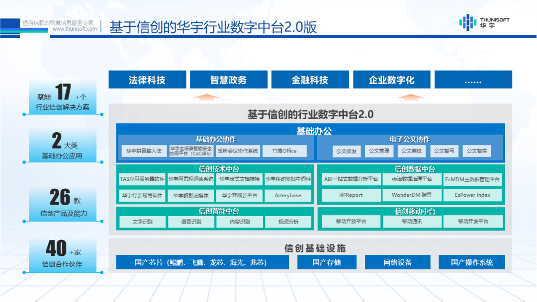 未来,华宇将继续以信息技术应用创新为基础,利用好人工智能、互联网、5G等新一代信息技术,加大重要产品和关键核心技术研发,为行业提供自主可控、安全高效的智慧解决方案,与伙伴共建信创共赢生态,共助国家信息技术创新产业的腾飞。