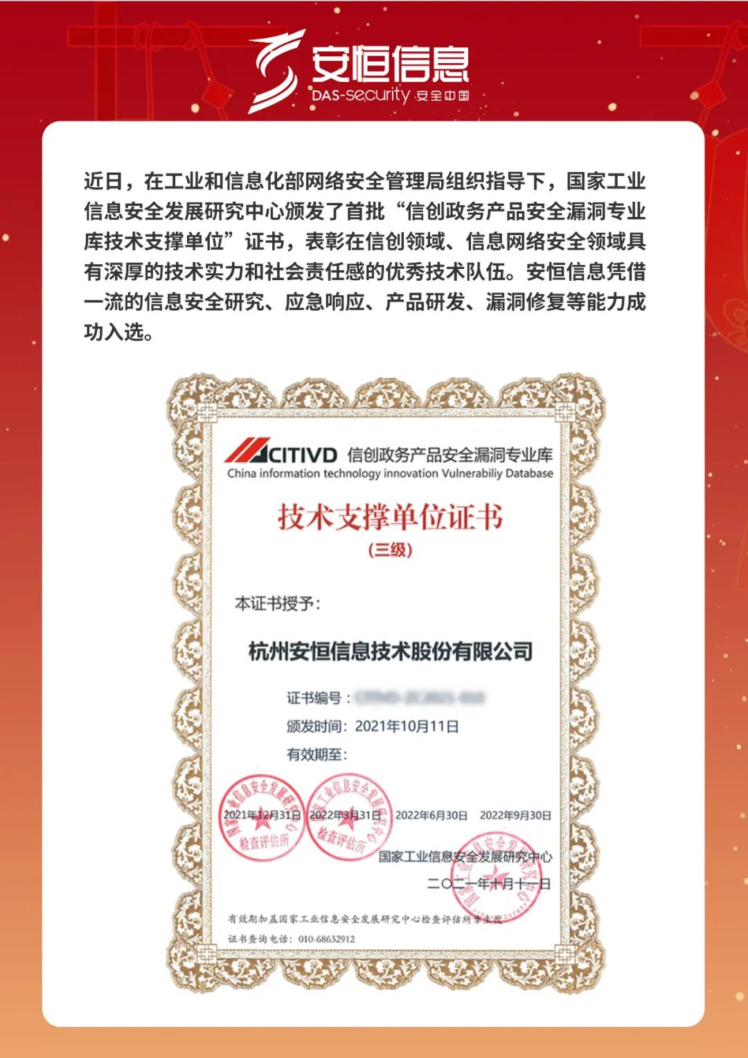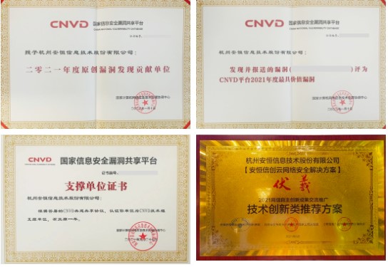 凭借在信创领域领先的漏洞发现、分析、处置能力,安恒信息先后荣获国家信息安全漏洞共享平台(CNVD)颁发的2021年度“原创漏洞发现贡献单位”、“技术组支撑单位”称号,自主发现的某漏洞获评“最具价值漏洞”;荣获国家信息安全漏洞库(CNNVD)颁发的“技术支撑单位”证书;安恒信创云安全解决方案荣获由国家工业信息安全发展研究中心颁发的“2021年信息技术应用创新安全优秀解决方案”。