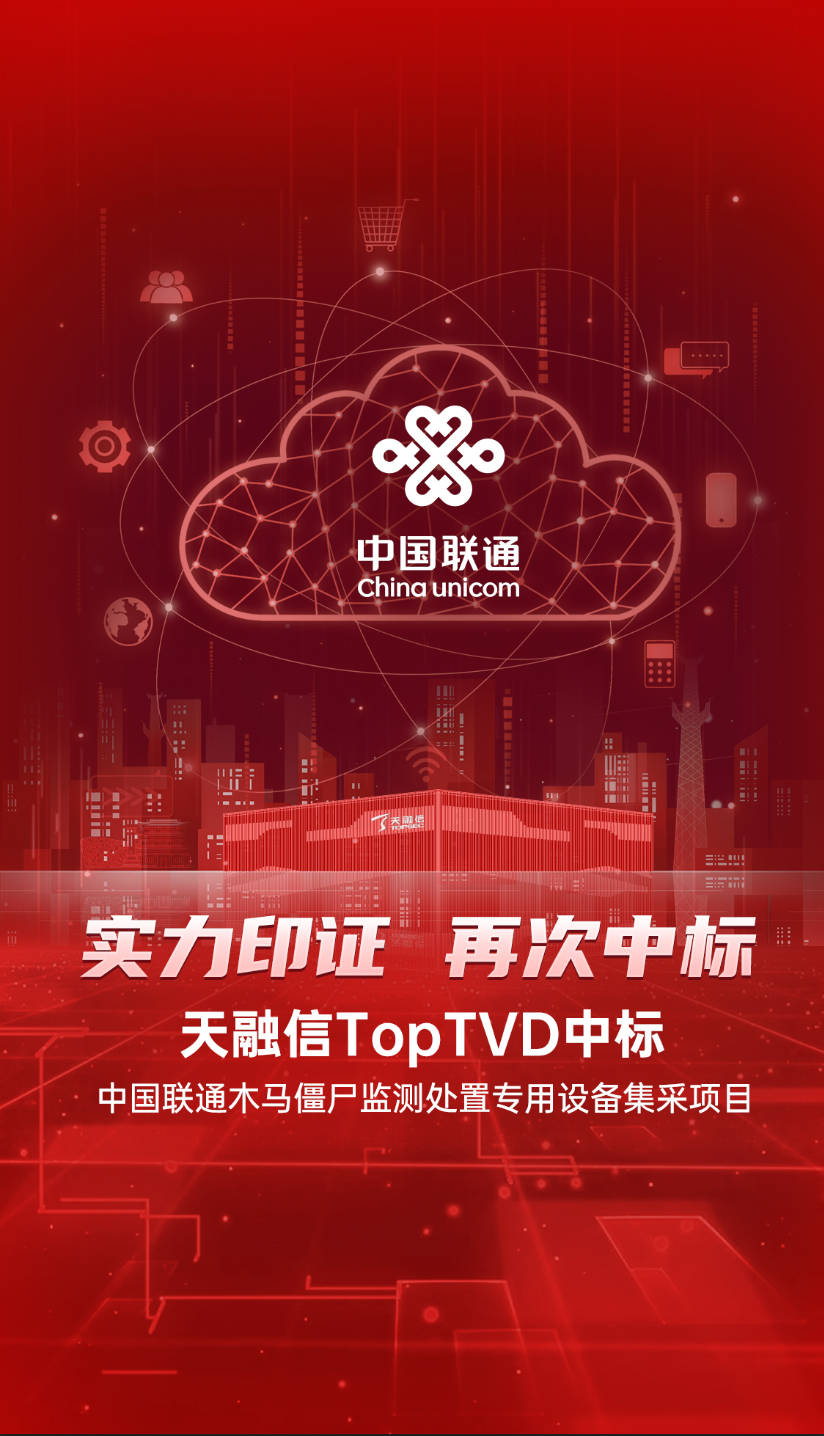 近日,中国联通对外公布了2022年中国联通木马僵尸监测处置专用设备集中采购项目的中标结果,天融信僵尸网络木马和蠕虫监测与处置系统(简称TopTVD)成功中标。