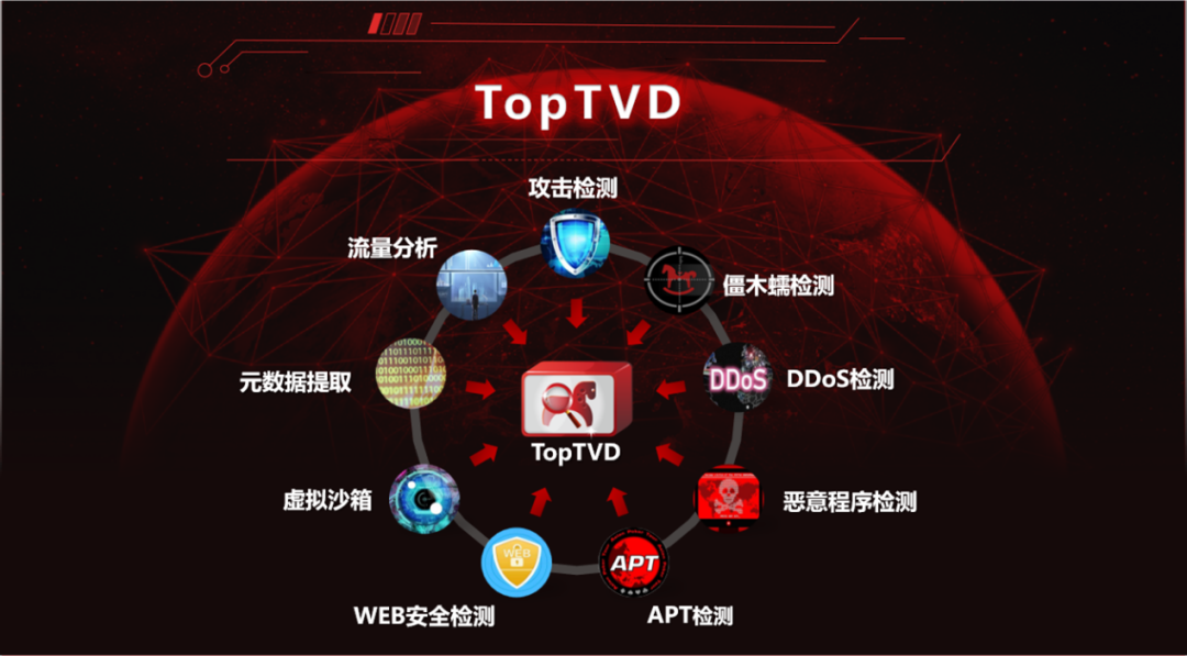 TopTVD产品集攻击检测、僵木蠕检测、DDoS检测、恶意程序检测、APT检测、WEB安全检测、虚拟沙箱、元数据提取、流量分析九大功能于一体,首创应用TAI-1智慧引擎+虚拟沙箱技术,结合嵌入式威胁情报库实现了多种威胁全面检测,有效实现对网络威胁全面多维的检测效果。目前已在政府、运营商、能源、金融等大流量复杂环境中被广泛应用。