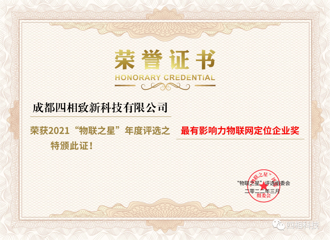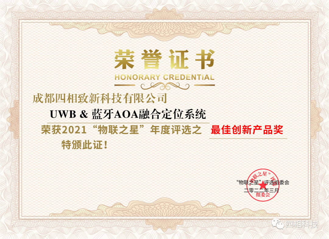 深耕位置物联网领域多年,凭借出色的技术实力和行业影响力,继在2020年度“物联之星”评选中喜提双奖后,四相科技在2021年度“物联之星”评选中再次斩获双项荣誉,不仅蝉联“中国最有影响力物联网定位企业奖”,还凭借UWB& 蓝牙AOA融合定位系统荣获“2021中国物联网最佳创新产品奖”。