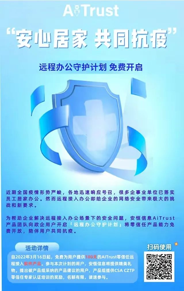 为积极落实国家、省、市有关疫情防控工作部署,安恒信息积极主动承担企业公民社会责任,发挥网络安全产品开发、技术研究及安全服务优势,结合防疫期间各种场景应用,及时推出多种安全产品应用及工具软件,为助力打赢疫情防控阻击战、稳定经济社会大局提供有效的信息化解决方案。其中,安恒信息AiTrust作为以零信任网络架构为底座打造的新一代数字化安全接入平台,能够有效解决传统VPN存在的应用短板,面向社会各界全面开放180天免费软件使用服务,并免费提供7x24小时技术专家服务,助力企事业单位构筑坚实的数据安全屏障。