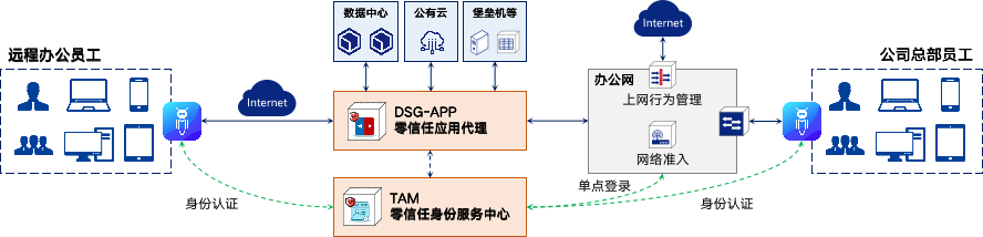 ①远程办公访问内部业务系统场景:普通办公人员访问公司的OA、审批系统、知识管理系统,以及公司的邮件、即时通讯、视频会议系统等。