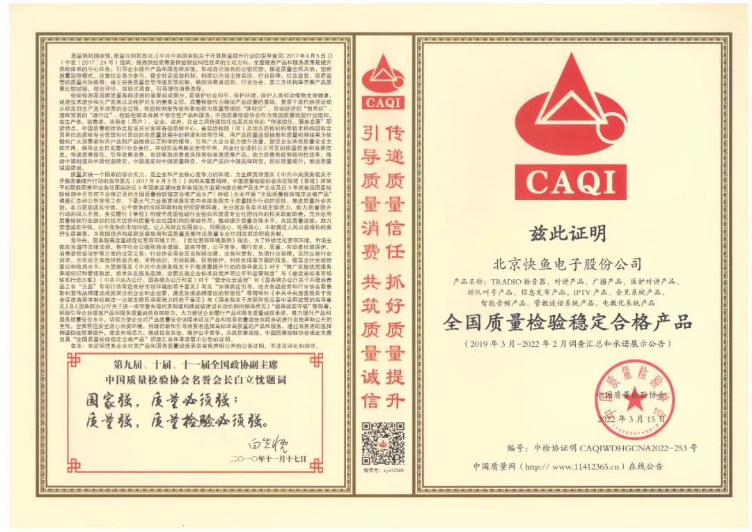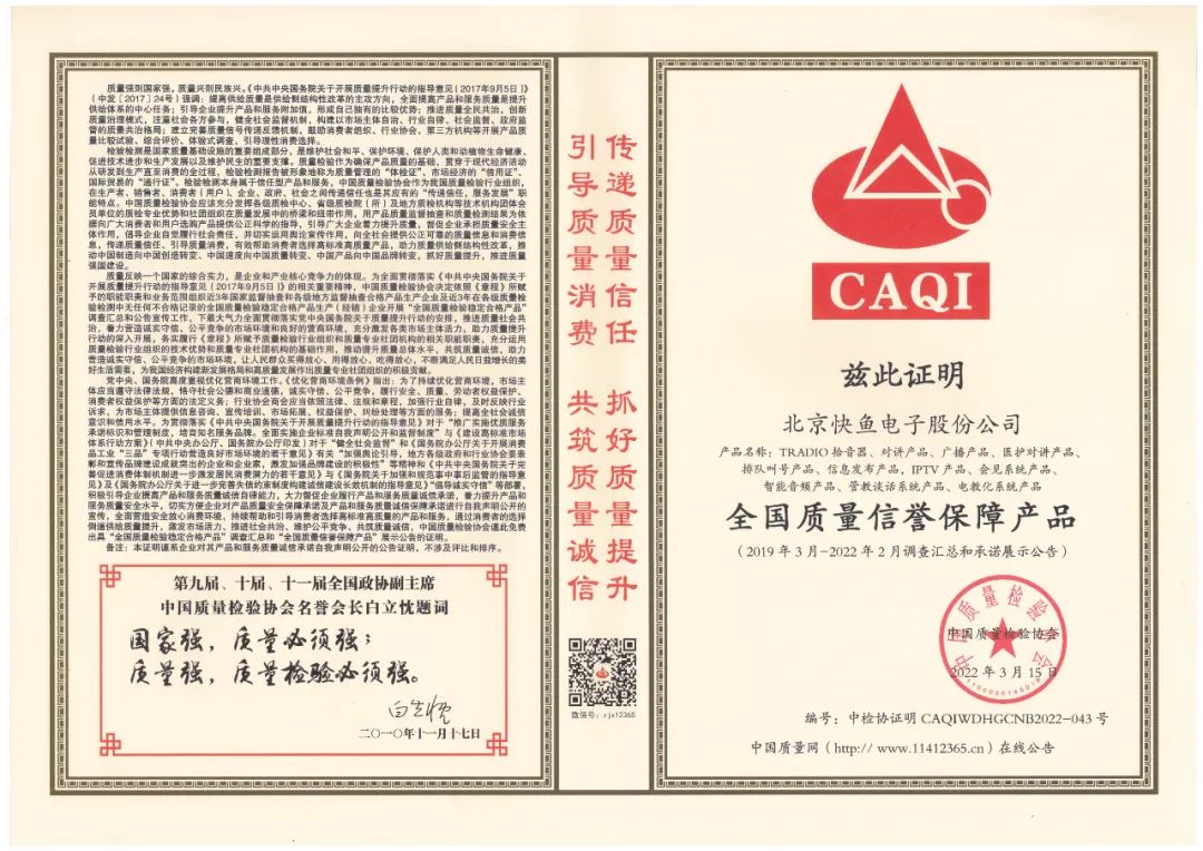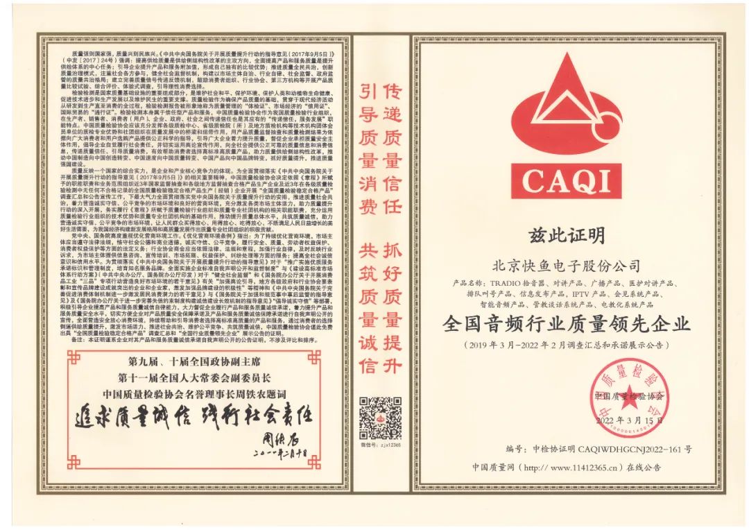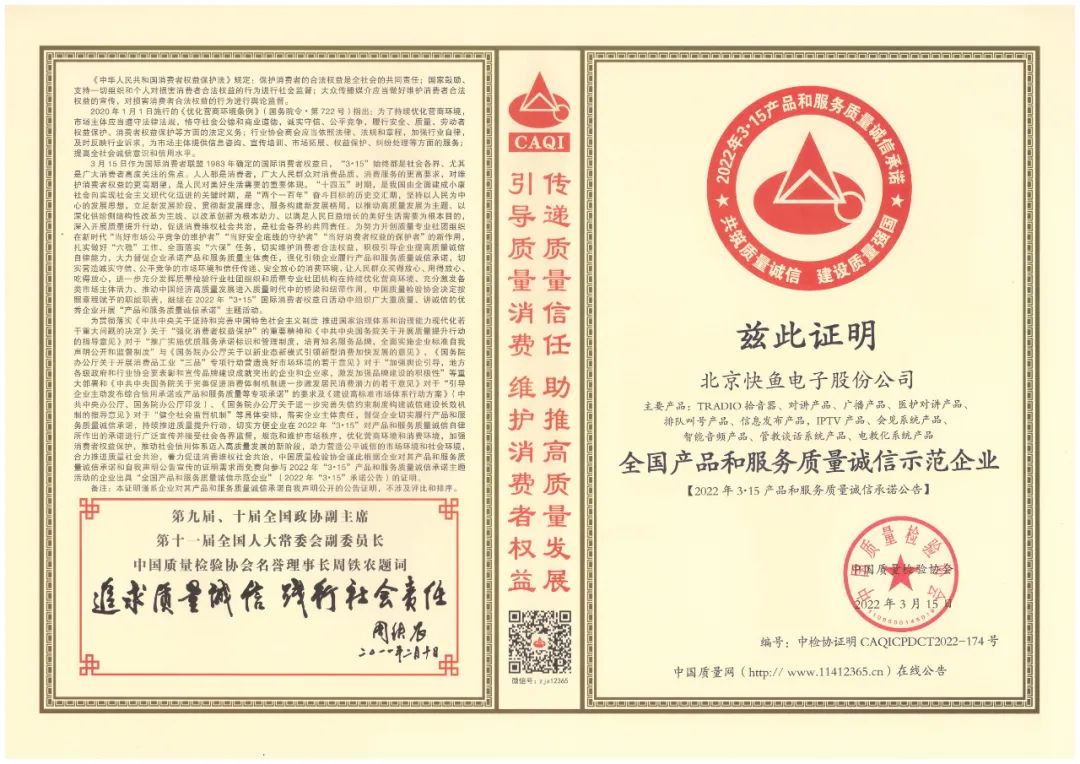北京快鱼电子股份在由中国质量检验协会主办的《2022年“3·15”国际消费者权益日“产品和服务质量诚信承诺”主题活动·全国产品和服务质量诚信承诺企业公告》中被荣誉提名,并荣获:《全国音频行业质量领先企业》 《全国产品和服务质量诚信示范企业》 《全国质量检验稳定合格产品》 《全国质量检验信誉保障产品》 《全国质量信誉保障产品》等荣誉证书。