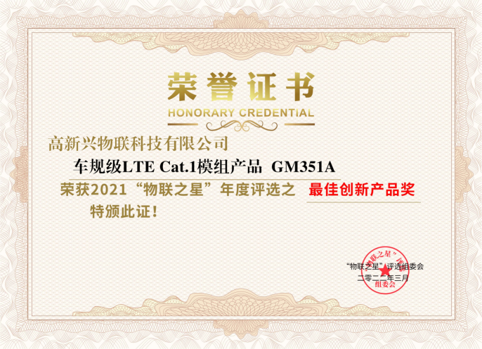 2022年3月16日,“2021物联之星”中国物联网产业年度评选结果正式公布。高新兴物联科技有限公司的车规级LTE Cat.1模组产品GM351A最终从数百余家参评企业产品中脱颖而出,获得了“最佳创新产品奖”。