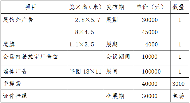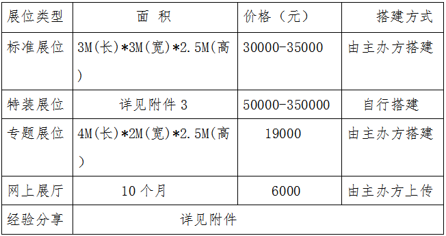 说明:标准展位9 M²(3*3),包括三面展板、一张洽谈桌、两把椅子、两支射灯、一个220V*5A电源插座、地毯(需向主办单位提供展位楣板文字,参加线下展赠送网上展)。