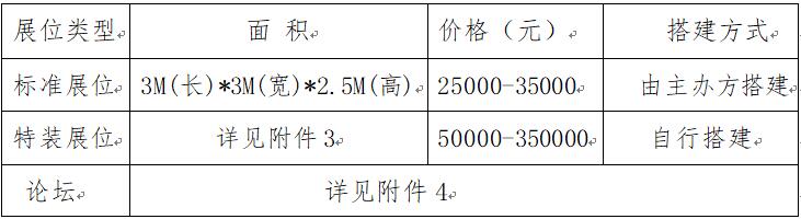 说明:标准展位9 M²(3*3),包括三面展板、一张洽谈桌、两把椅子、两支射灯、一个220V*5A电源插座、地毯(需向主办单位提供展位楣板文字)。