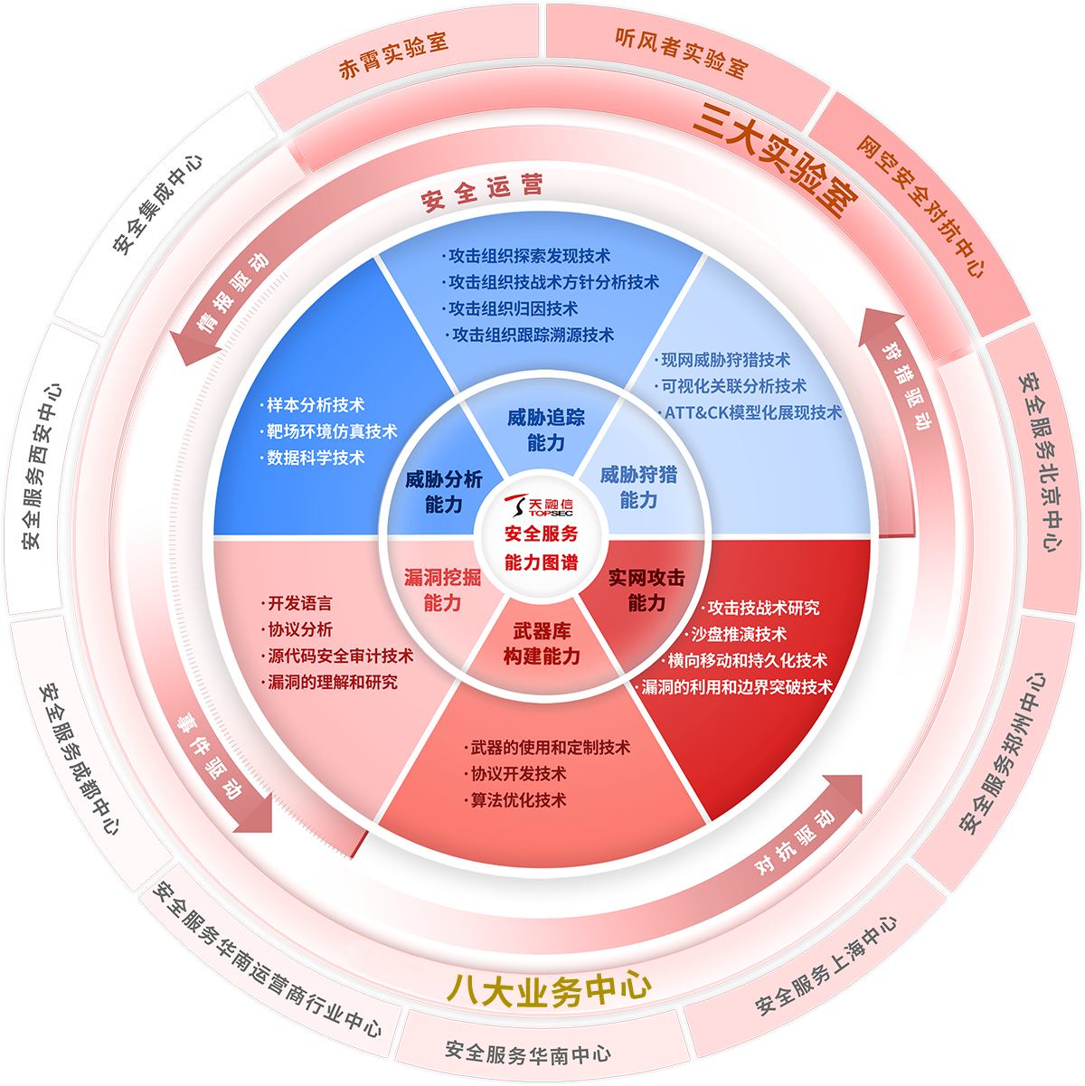 基于长期的一线保障服务及多年国家级攻防演练经验,天融信已具备完善的安全服务体系,通过咨询保障、红蓝对抗、安全运营、新技术测试、行业专项、安全集成6大类专业安全服务,为全国各行业客户提供长效的安全支撑。