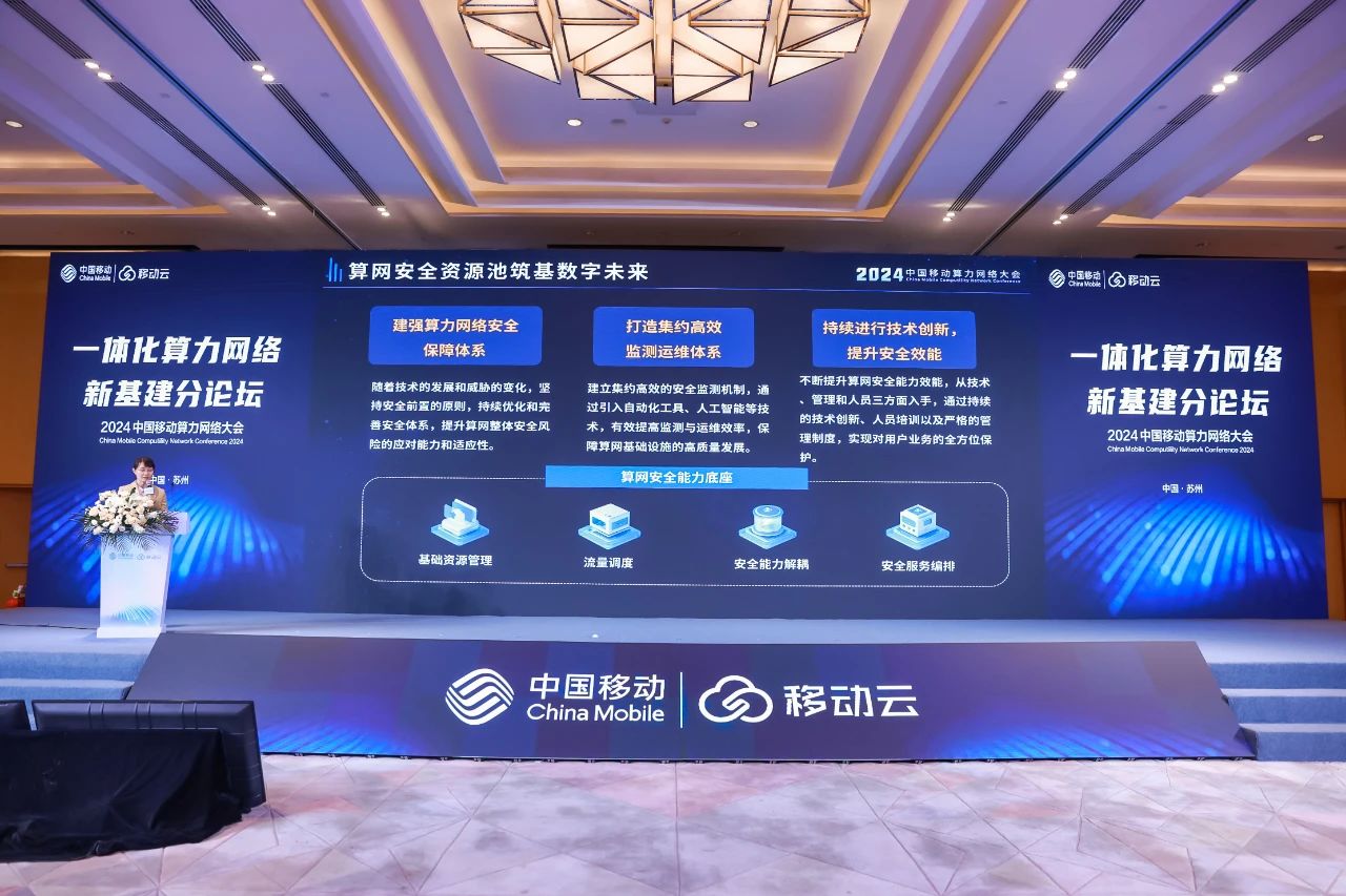 近日,2024中国移动算力网络大会一体化算力网络新基建论坛在苏州金鸡湖国际会议中心召开。启明星辰受邀出席论坛,并参与成果发布、主题演讲多个环节,助力中国移动加快构建全国一体化算力网络体系,为科技创新和数字经济发展提供坚实的安全基础。