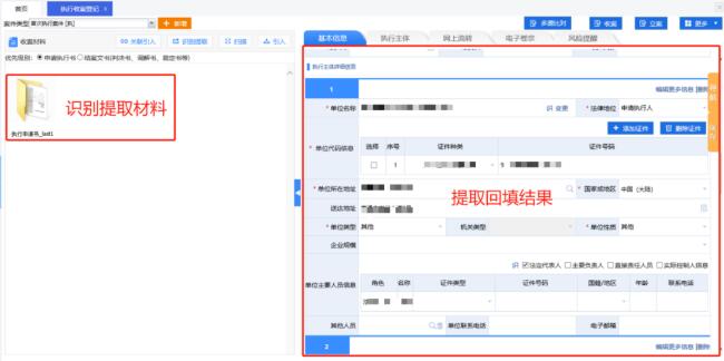 智能提取信息要素。运用电子卷宗数字化处理结果,智能提取材料中的信息要素,辅助应用到立案、文书制作、财产查控等各个阶段,实现各类信息的智能回填,减少人工输入和校对工作量。