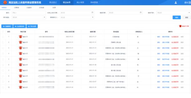 移卷人申请上诉案件移转后,由诉讼服务中心进行移送审查,并对所有上诉移转案件进行统计管理。诉讼服务中心通过移送审查功能可以根据上诉案件移转情况设置“未移送”“已移送”“已退回”“已完成”四类状态。诉讼服务中心以二审立案庭审查标准为依据,对移转的上诉案件是否合格进行审查,并根据实际情况决定是否将案件由“未移送”状态变更为“已移送”“已完成”或退回至移卷人处修改。
