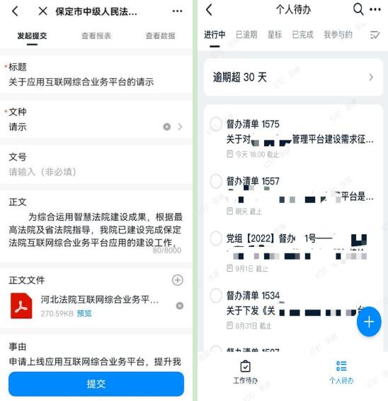 保定两级法院依托互联网综合业务平台实现公文办理、公文审批、外出审批、请假审批、疫情打卡、待办任务、线上答题等一系列功能线上操作,法院干警可通过平台进行全流程无纸化办公,大大提高了办公办案效率。特别是通过待办任务功能,将工作目标细化分解、责任到人、明确时限,有效提升了工作效率,为实现跟踪2022年度工作目标完成情况提供有力支撑。