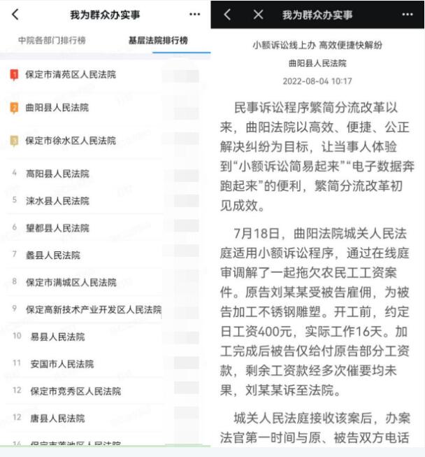 为贯彻落实最高法院“为群众办实事示范法院”创建活动决策部署,巩固政法队伍教育整顿成果,在保定中院党组的指导下,保定两级法院充分利用互联网综合业务平台开展“我为群众办实事”排行榜活动,全市法院干警可通过法院专网、互联网综合业务平台实时查看中院各部门、基层法院排名及办事详情。自活动开展以来,全市法院共推送《我为群众办实事》稿件2300余篇,法院干警服务意识显著增强,司法作风明显改进,形成了良好的示范推动效应。