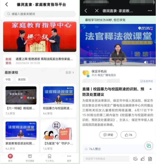 为深入学习贯彻落实习近平总书记关于家庭家教家风建设的重要论述,认真贯彻上级法院关于落实《家庭教育促进法》的部署要求,保定中院与保定妇联共同搭建上线“德润直隶·家庭教育指导平台”。该平台依托法院线上学习平台,整合法院宣传、学校教育、心理指导等专业课程,将线下发令、线上学习相互融合,采取全时段、全方位、全体系的线上家庭教育指导优质课程,全方位、立体化推进未成年人家庭教育和未成年人保护工作开展。