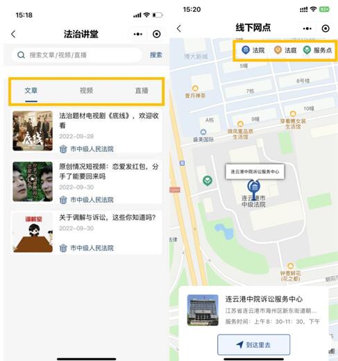一地图了解全市法院诉讼服务中心、法庭、审务站等线下服务网点,查看工作时间和地址信息,还可实现一键导航。