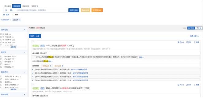 平台具备全量的法律法规数据库,用户可根据效力级别、时效性、发布机关、地域范围及颁布年份对法律法规进行筛选,精准提供检索结果。当已经输入的关键词无检索结果时,平台会自动进行模糊检索。