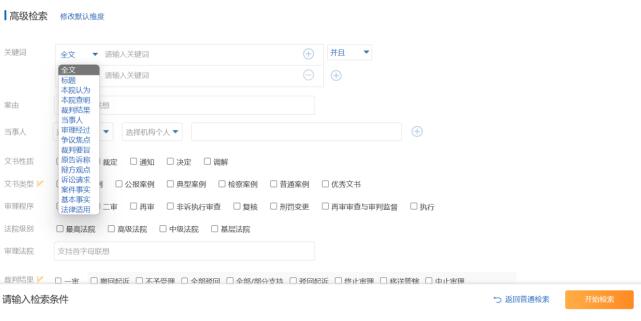 平台支持多个关键词在多个文书区段中检索、支持关键词之间同时包含不同逻辑关系、智能推送关键词的近义词、一次检索中同时包含多种检索维度。可实现在一次检索中整合多种检索维度,支持标题、案由、审判人员角色等31个维度进行交叉检索,增设裁判结果类型、量刑情节、标的额、罚金数额等类案标签检索,同时提供与所输入的关键词意思相近的词语进行检索,关键词之前可以插入“并且、或者、同句、同段”等逻辑关系,帮助用户全方位精准定位裁判信息。