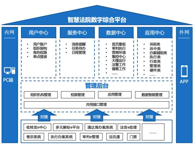 管理后台可实现对平台的集约化和配置化管理,满足不同用户角色的功能和数据使用需求,同时为平台应用的持续性扩展提供接口服务能力。平台底层通过与法院已建设和待建设的信息化系统对接,实现对个信息化系统的能力和数据的高效获取,使平台成为智慧法院建设的中枢大脑。