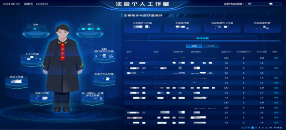 依托平台,可视化大屏可将各项数据指标以图表形式实时动态展示。通过不同工作性质(审执部门和综合部门)、不同层级(法院、部门和个人)、不同角色(院庭长、法官、法官助理、书记员等)、不同时间周期等不同维度对办案质量、办案效率、重点关注等不同指标进行数据分析展示,形成横向联动、纵向贯通、点面结合的考核模式,为个体化、类别化的绩效考核提供基础。
