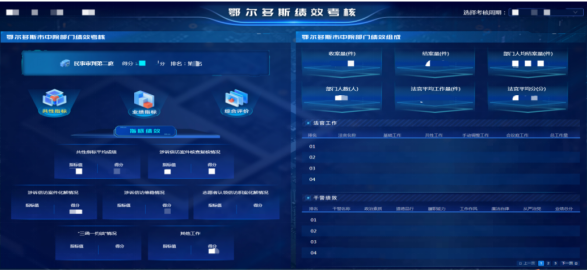 内蒙古自治区鄂尔多斯市中级人民法院在2023年最高人民法院印发《法院人员考核工作指引》后,以“考实、评准”干警工作实绩为目标,以“用好、用足”德才兼备干部为工作导向,做实最高人民法院“全员、全面、全时”要求,落实最高人民法院张军院长在国家法官学院2024年春季开学典礼中提到,“要用好绩效考评‘指挥棒’。要把案件管理和队伍管理融合起来,把评‘案’与考‘人’贯通起来,一体抓实。”的指示,在自治区党委和最高人民法院的指导下,按照“对标最高法院、紧盯全国先进、打造内蒙古特色、争创全国一流”工作思路,结合本市实际,聚焦绩效考核、服务审判执行、服务司法管理、服务廉洁司法,制定了《鄂尔多斯市中级人民法院绩效考核及奖金分配办法》《鄂尔多斯市中级人民法院关于2023年度部门和个人绩效考核的通知》等相关考核办法。并创新提出以数据中台建设为牵引,以工作指标和审判质效考核指标为导向,深度分析挖掘绩效数据信息,立足“全省领先、全国一流”建设目标,打造了质效融合管理平台,全面推进法院干警考核工作智能化、透明化。