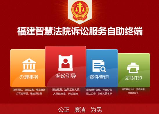 连城智慧法院诉讼自助终端系统是司法自助服务专用设备。主界面有四大主要功能,一是【办理事务】、二是【诉讼引导】、三是【案件查询】、四是【文书打印】。这四大功能基本满足诉前、诉中、诉后三方面需求,依托法院专网,实现司法数据与法官、当事人、代理人(律师)之间的共享、查询与交互,互联互通,解决法院文书送达难和群众诉讼难的实际问题,提高法院自助服务水平,填补国内司法自助服务的空白。