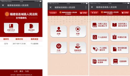 2018年3月,连城法院上线福建法院系统首个一站式、便捷化、智慧型的移动微法院小程序,正式面向社会公众提供全天候、零距离、无障碍的诉讼服务。一是操作简便不分年龄。“连城微法院”小程序平台,无须下载安装,通过关注该院微信公众号或搜索“连城微法院”小程序即可方便使用。平台实现了在线调解、立案、案件查询、送达、执行曝光等功能,面向公众和当事人提供了23个栏目模块,是福建法院首个全流程覆盖的微信移动办案诉讼平台。二是突破异地障碍。异地当事人可借助电脑、手机屏幕就可实现调解“面对面”或庭审“面对面”,能为公众提供全天候、零距离、无障碍的诉讼服务。三是首创执行悬赏、执行线索在线提交。平台开设了执行曝光、执行悬赏、执行线索提交等功能,当事人通过微信小程序提交图片或视频等执行线索。四是“刷脸查案”。充分发挥技术创新融合优势,使用深度学习等人工智能前沿技术,能够实现“刷脸查案”和“在线庭审”,并与该院诉讼服务网、中国庭审公开网等实现无缝对接。当事人通过输入姓名和身份证号码后,只需对着手机屏幕拍照,系统自动比对公安数据库信息,完成人脸和语音双重身份识别,即可了解自己案件的进展情况。五是 “微信送达”。当事人在立案后可获得一个案件码,使用案件码可在微信上签收相关法律文书,体验在线开庭、电子送达等服务,大幅提升司法效率,增强群众司法获得感。六是司法公开 “ 触手可及 ”。微法院小程序对接中国庭审公开网,公众可方便观看在线庭审直播或录播。该院还开展福建省首场“带字幕”庭审直播,整个庭审过程对庭审中的各角色的发言自动转写为文字。