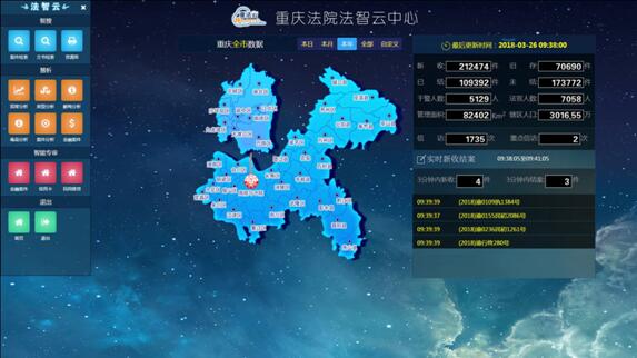 始终坚持开拓创新,不断提升重庆法院法智云中心智能化水平,为法官办案、法院管理提供全方位智能服务。升级“智搜”平台,引入百度等人工智能领军企业,结合国内现行标准和法院实际情况,打造大数据智能搜索系统。通过智能一键搜索,实现结果的精准匹配和关联度排名。搜索的数据范围涵盖案件信息、文书、电子卷宗、案例、法律法规以及内网网站信息等,让法官和管理者可以快速检索、直观浏览。完善“慧析”平台,向全市法院干警提供智能化数据共享、数据分析和数据预测等服务的同时,启动差异化司法大数据分析服务。拓展定制分析的范围,纳入更多分析专题,实现定制化分析的扩容,常用分析图表实时生成。实现非结构化数据分析,利用智能化技术实现对文书和电子卷宗信息的综合分析。通过汇集整合各类数据,实现全市法院“案件—人事—财物—外部数据”的一体化分析。