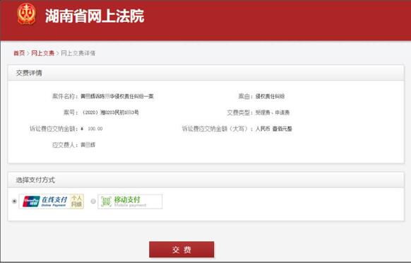 1.“网上法院”缴费(见图2)。当事人(诉讼代理人)可以登录湖南“网上法院”,打开缴费缴费界面,选择网银在线支付、微信或支付宝任意方式缴费。