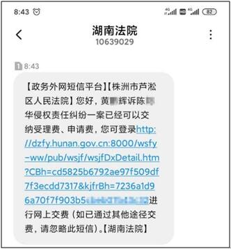 2.短信送达缴费(见图3)。当事人(诉讼代理人)通过湖南法院短信平台发送缴费通知短信,点击链接,截取链接生成的二维码,用微信、支付宝扫描缴费。