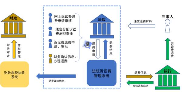 法院诉讼费管理系统与“数字法院”业务系统、“湖南网上法院”、财政厅非税执收系统、省政府政务短信平台、银联和10家银行业务系统实现了互联互通,真正实现了诉讼费业务跨单位、全业务、全流程的工作协同和数据共享。