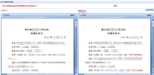 系统可以实现对上网裁判文书敏感信息的自动识别、自动替换保护,并提供屏蔽前、屏蔽后文书对比查看功能,方便法官进行屏蔽结果的核实。