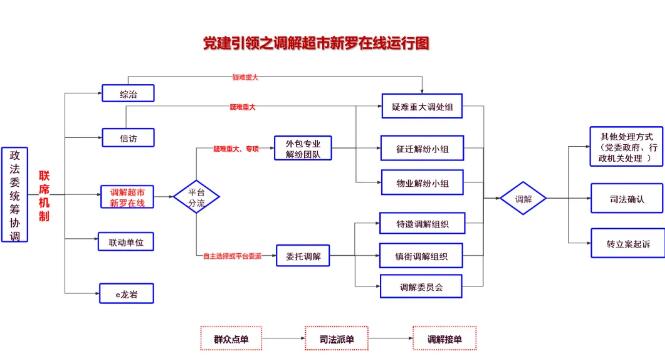 由新罗区党委统一领导、政府主导负责,新罗法院建立了“调解超市新罗在线融平台”总中心,在派出人民法庭、各镇街司法所、行业协会、重要行政部门等设立分点,对接征迁、物业、交通等专业调解和各镇街区域调解平台,以实体、热线和网络三大平台为载体,全面整合新罗区各类解纷资源,为公众提供专业化、可信任的纠纷解决渠道,努力实现“平台吹哨、分点共调”的效果。