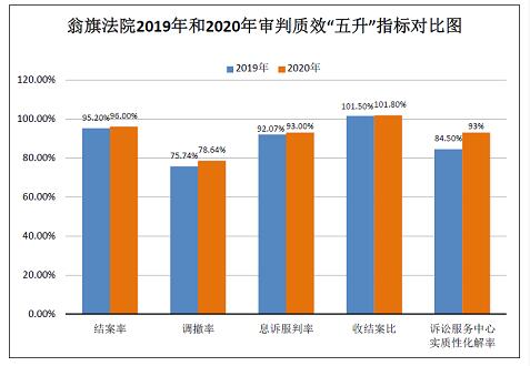 该院审判质效呈现“五升五降”的良好态势,执行“3+1”核心指标稳中向好,均位居全市基层法院前列。2019年4月,最高人民法院将翁旗法院确定为“全国基层法院信息化建设试点单位”。2020年,翁旗法院院党组书记、院长韩跃杰分别被授予2019年“中国电子政务年度人物”“内蒙古自治区十大法治人物”荣誉称号。