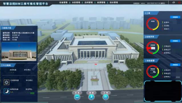 近日,这些问题终于得到了解答——山东省东营市中级人民法院借助物联网、BIM(建筑信息模型Building Information Modeling,简称BIM)三维可视化等科技手段,建成智慧法院大楼BIM三维可视化节能管控平台,实现了法院大楼主要用能系统、各智能化系统、智慧物业的高度集成与智能管控,提升了建筑能效与后勤管理效率,为物业运维管理工作提供更高效有力的支撑。