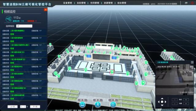 点击视频查看选项,在BIM模型中选中摄像机模型,可调取东营中院全院545个高清监控摄像头的实时监控画面,同时也可调取摄像机的历史画面,对法院内外及干警、当事人的活动区域进行360°全方位、无死角的监控,实现安防管理可视化。