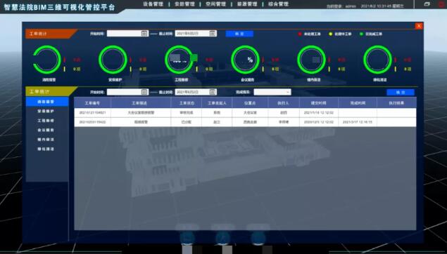 智慧法院BIM三维可视化运维平台首页包含建筑整体外观模型查看、建筑幕墙渲染模型、建筑整体外立面效果等,也包含各功能板块关键数据的汇总显示,帮助管理者在首页中通过关键的汇总数据和指标快速掌握大楼的整体运行状况。