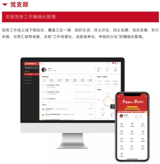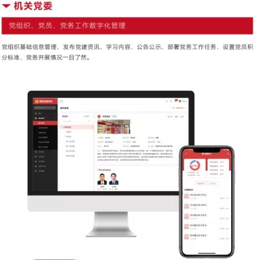 把支部建在网上、把党员连在线上。智慧党建平台利用现有政务资源,采用分域分级分权的层次化管理架构,按照业务种类建立管理树,布建Web端、手机APP等应用前端,并将党员干警集中到智慧党建平台办公,适时开展党务工作。