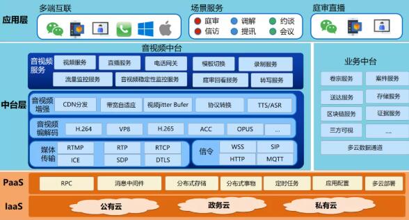 采用中台化研发。系统采用双中台部署模式,在法院专网和互联网分别部署双中台,将庭审需要的音视频、语音识别、电子签名等能力进行中台化,在网络带宽足够的情况下,可以无限制扩展法庭数量。