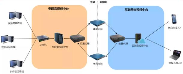 支持跨网系开庭。通过“音视频+数据光闸”的模式,实现内外网音视频交互高清流畅,内外网音视频穿透延时小于100ms,处于国内领先水平。