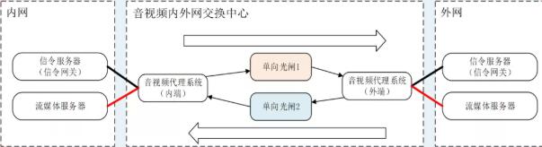 音视频内外网交换中心。音视频内外网交换中心负责音视频的安全、无延迟交换。交换中心与音视频“双中台”对接,通过协议封装,以信息摆渡的方式实现单向音视频数据无延迟传输,结合设备认证、格式检查等安全功能,满足数据安全隔离交换相关法标要求。