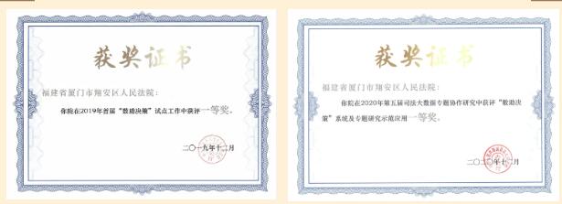 依托“数助决策”实践基地的长效机制及特区敢为人先的干事创业精神,翔安法院以实效先后获得最高人民法院办公厅颁发的2019年首届“数助决策”试点工作一等奖和2020年“数助决策”系统及专题研究示范应用一等奖。