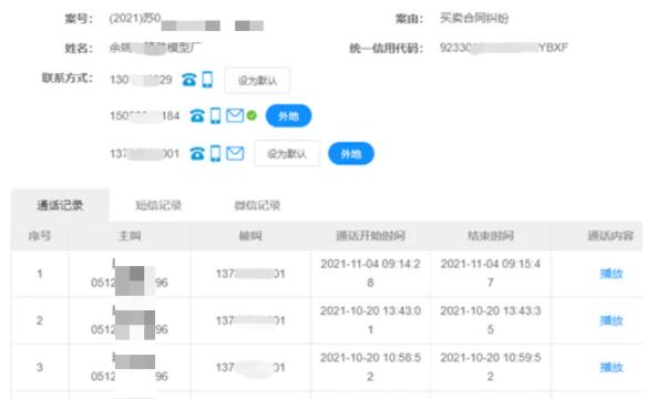 对接通讯运营商。自动解析案件当事人、法定代表人、负责人在通讯运营商登记的电话号码,实现一键拨打、短信告知,全程录音留痕。