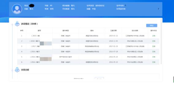通过大数据分析技术,对当事人的基本信息、涉诉情况、涉案财产情况、社会关系等内容进行可视化分析,对当事人参与司法活动的行为情况进行分析,评估案件的审判和执行风险,根据当事人的涉诉情况查找本案的关联案件,为有效化解矛盾纠纷、节约司法资源起到重要作用。