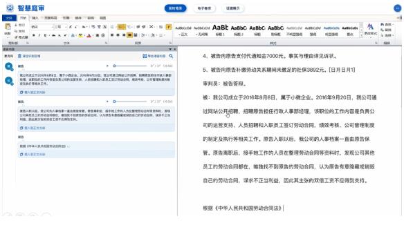 智慧法庭以自然方式进行交互,通过“看、听、说、点、拖、划”六个基本动作即可完成绝大部分交互操作,法官、当事人上手无难度;智慧法庭主动推送使用者所需,结合法律知识库庭审中需额外辅助内容的时候,系统自动进行相应的推送,法条、案例、名词释义、相似笔录、历史笔录等;智慧法庭自动生成使用者所要,庭审提纲、审理要素、争议焦点、庭审笔录、裁判文书等以往耗费大量人工、时间的内容,系统均可高比例自动生成,节省有限资源。