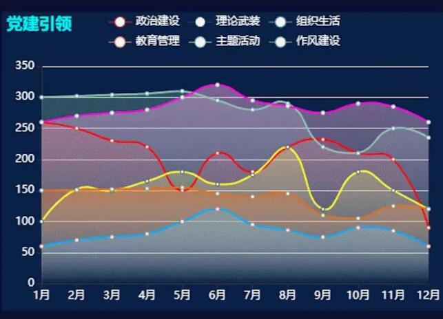 平台首页最上侧为导航菜单,分为党建引领、质效提升、作风改进、考评管理和其他功能五部分。平台支持图形化地分析收结情况、结收比等数据情况,通过图像的方式直观地展示各个统计表的情况,同时预警信息也会在系统中展示。