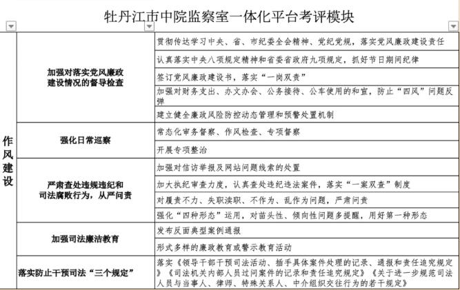 除了要打造“软”环境,还必须要建立“硬”指标。牡丹江中院制定的四项重点工作任务目标,其中之一就是要“抓绩效考核”,不能让“干好干坏一个样、干多干少一个样”。牡丹江中院根据具体工作制定了一整套完整的考核体系,并将考核项目、评分标准、部门及个人评分、总分排名等统计模块集成到“一体化平台”中的党建引领版块,包括对支部、部门和个人的党建考核,最终成绩都会纳入牡丹江中院绩效考核总成绩。年终时,每个部门、每个人都会有排名,此项排名是牡丹江中院选人用人的重要指标。